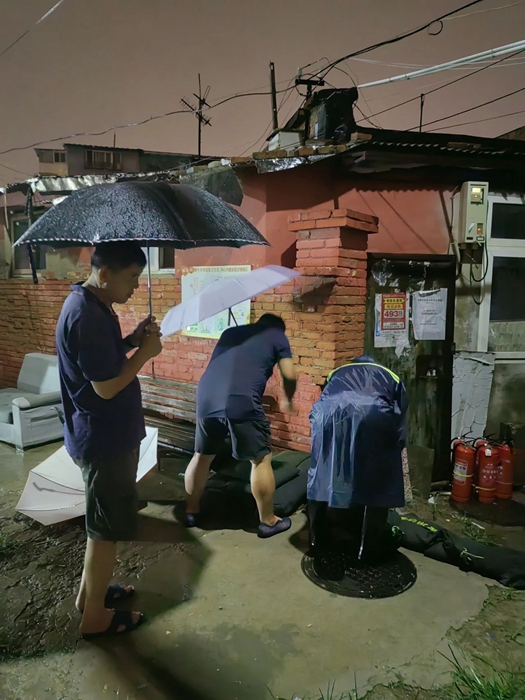 大郊亭3號院地理位置復(fù)雜,居住居民較多,地勢偏低,工作人員提前到崗,架設(shè)多臺水泵,在大雨期間采用階梯式排水方法,逐步由院內(nèi)向院外排放積水,確保院內(nèi)無積水,居民家中無淹水。