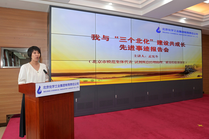 在先進(jìn)事跡報(bào)告環(huán)節(jié),市勞動(dòng)模范,華騰新材總工程師崔正攜《以使命為船,以熱愛為帆,在時(shí)代洪流中奮勇爭(zhēng)先》;市模范集體代表,試劑所總經(jīng)理助理、質(zhì)量檢驗(yàn)部部長(zhǎng)孟憲冬以《傳承工匠精神,助力“三個(gè)北化”,試劑所質(zhì)量檢驗(yàn)部的奮進(jìn)之路》為題,圍繞個(gè)人成長(zhǎng)、科研開發(fā)、團(tuán)隊(duì)建設(shè),自信講述與北京化工共同成長(zhǎng)的點(diǎn)點(diǎn)滴滴。